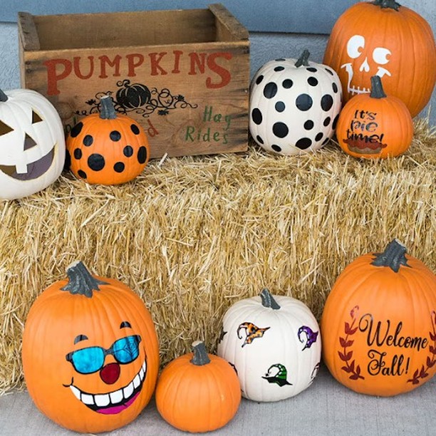 The combination of drawings and stickers creates playful, carnival-like pumpkins that seem to giggle with joy. They bring such cheerful energy to fall displays with their bright, whimsical designs.
