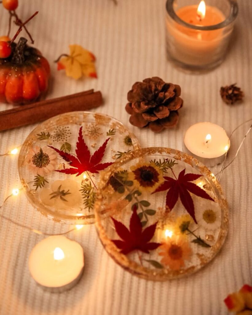 Resin crafts are having a major moment, and fall-themed pieces are especially popular! Create coasters and keychains with pressed autumn leaves, glitter, or fall-colored alcohol inks. The glossy finish looks so professional, and you can experiment with different molds and colors.