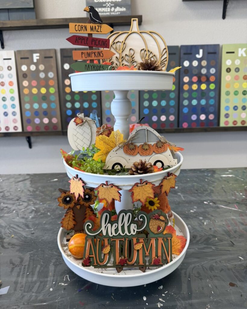 Tiered trays are everywhere on social media, and people are constantly looking for new seasonal décor sets! Create mini fall scenes with small pumpkins, wooden signs, tiny lanterns, and seasonal figurines that fit perfectly on three-tiered trays. The key is making everything cohesive with a specific color scheme or theme. Complete sets sell for $35-55, and you can source materials affordably from craft stores. People love switching out their tiered tray décor seasonally, so this has great repeat customer potential.