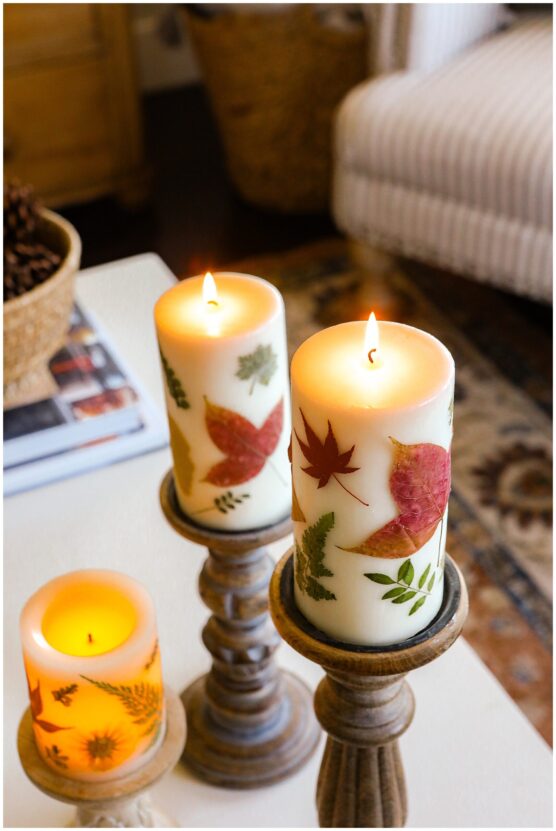 These candles are decorated with beautiful leaf impressions that create such elegant, natural patterns! The leaf designs might be pressed into the wax or printed on the surface, and they add such organic beauty to the simple candle shape.