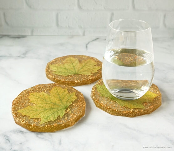 Real autumn leaves are preserved forever in clear resin to create these gorgeous, functional coasters! The leaves appear to be floating in glass, and all their beautiful details, colors, and veining are perfectly preserved.