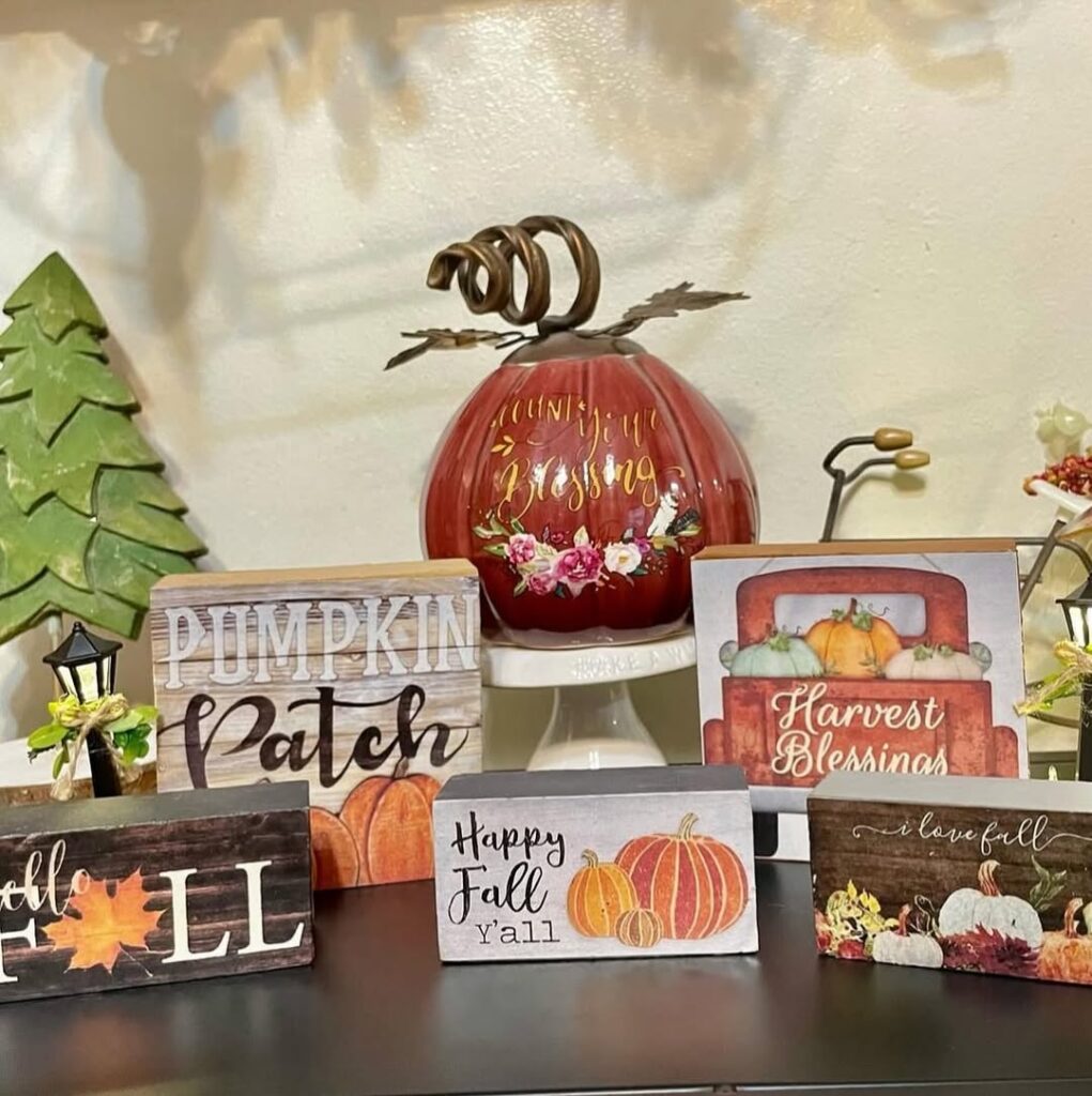 Chunky wooden blocks with painted harvest sayings like “Give Thanks” or “Blessed” create such warm, homey displays. The thick, substantial feel of the wood blocks gives them a quality, handcrafted look that’s so appealing. You can distress the paint for that vintage, weathered appearance, or keep it clean and simple for a more modern farmhouse style. Stack them together or scatter them around your home for little reminders of gratitude and the season’s blessings.