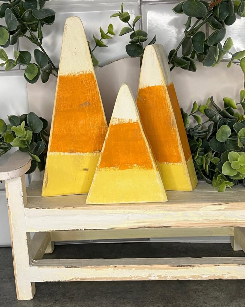 Wooden triangles painted in classic candy corn colors bring such fun, festive charm to your fall decorating! The natural wood grain showing through the paint gives them that perfect handcrafted appeal, and the iconic color scheme instantly says “autumn” in the most cheerful way. You can make them in different sizes and group them together for maximum impact. They add a playful touch to more serious fall decorations and bring smiles to both kids and adults who love this classic Halloween treat.