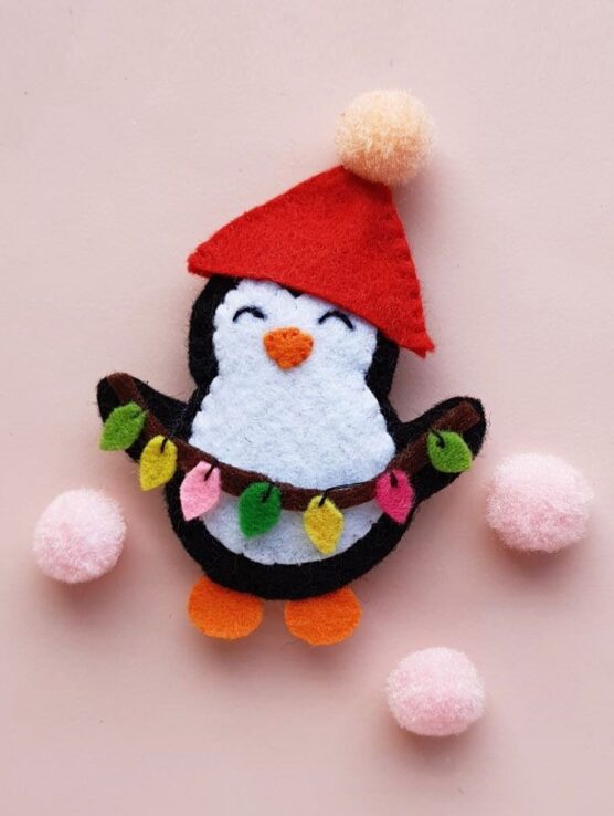 Dress your penguin in a colorful striped scarf made from thin felt strips and a matching hat, either a simple beanie shape or a tiny stocking cap with a pom-pom. Some penguins can hold little felt fish or candy canes. These whimsical characters add playfulness to any tree.