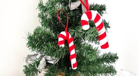Classic candy canes get a soft, crafty makeover in felt. Cut candy cane shapes from white felt and use red felt strips or embroidery to create the iconic stripes. You can sew thin red felt strips diagonally across the white base, or embroider the stripes with red thread using satin stitch for a smoother look.