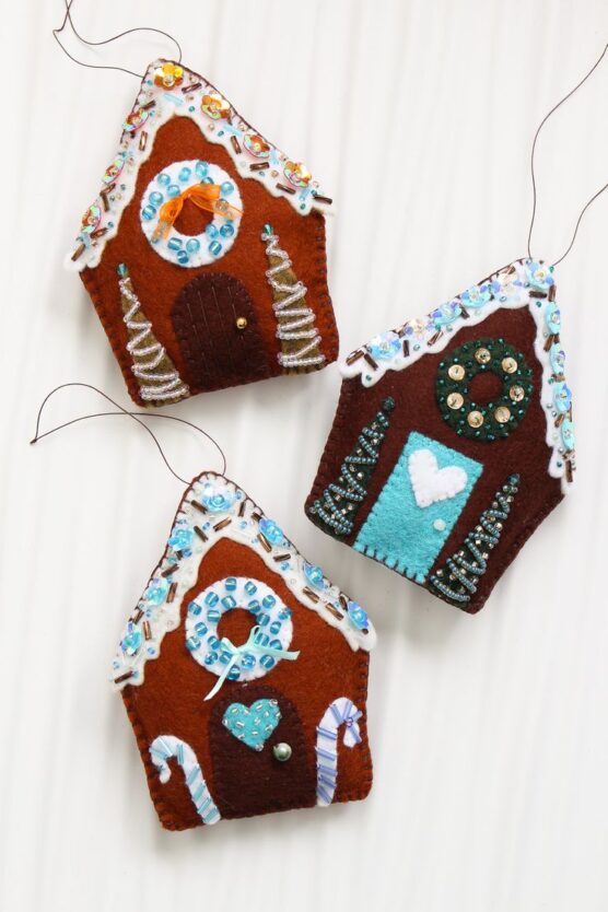 Add tiny pom-poms or beads as gumdrops along the roof line. Cut and attach felt pieces for a door and windows, maybe adding yellow behind the windows for a glowing effect. A candy cane by the door or a wreath adds extra detail.