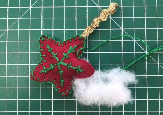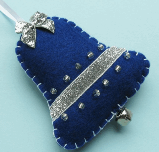 Decorate the outside with embroidered holly leaves, ribbon bows, or sequin embellishments at the top where the ribbon attaches. The ribbon loop that hangs the ornament can also create the look of the bell’s clapper. Use metallic thread for extra shine or keep it simple with traditional colors.