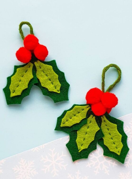 Simple yet elegant, holly ornaments capture the essence of Christmas. Cut two or three holly leaf shapes from dark green felt, making sure to create those characteristic pointed edges. Stack them in a cluster and secure at the center with a few stitches.