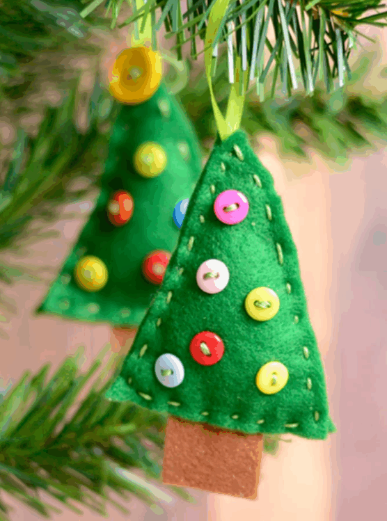 Sew on colorful buttons in different sizes to look like ornaments scattered across the branches. Add a yellow felt star or button at the top, and create a brown felt trunk at the bottom. A simple ribbon loop lets you hang these mini trees among the branches of your real tree.