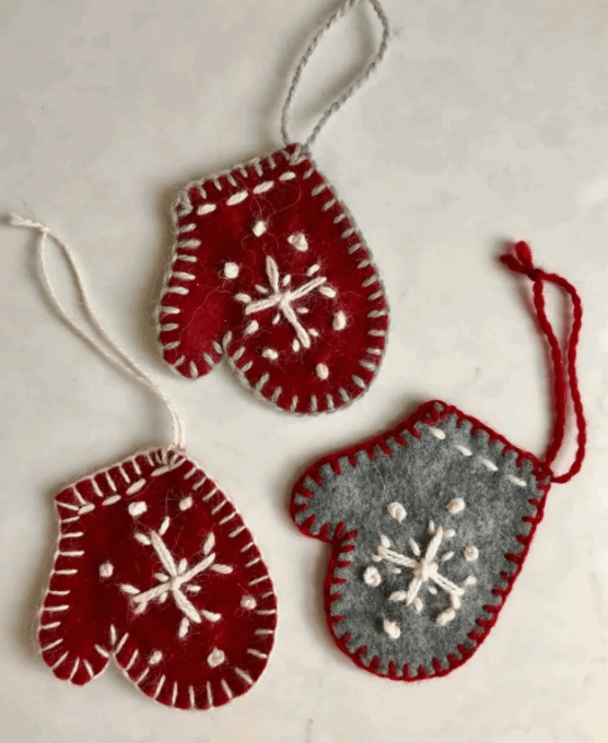 Cozy mitten ornaments remind us of winter warmth. Cut two mitten shapes from felt in festive colors like red, green, or blue. Sew them together with a blanket stitch, leaving the wrist open, and add light stuffing if desired. Embroider a snowflake design on the front using white or silver thread with simple star shapes or more intricate patterns.