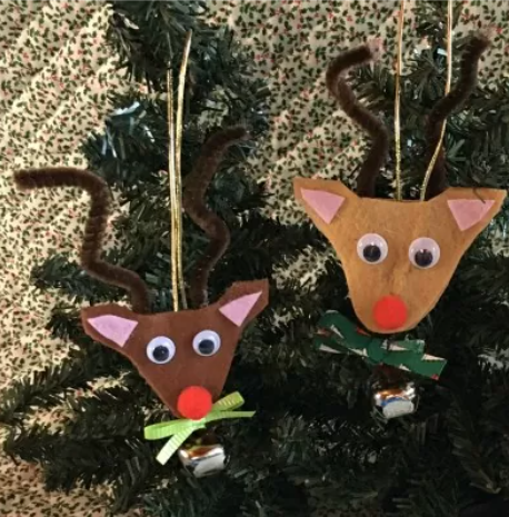 Reindeer ornaments always bring smiles with their playful googly eyes. Cut the reindeer head shape from brown felt and add a red pom-pom or felt circle for Rudolph’s nose. The googly eyes give instant personality and charm. Cut antlers from darker brown or tan felt and glue or stitch them to the back of the head.
