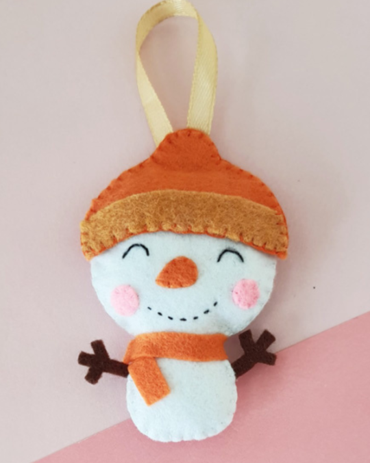 The scarf is where you can get creative with colors, using striped or patterned felt wrapped around the neck with fringed ends. Add black felt buttons down the front and maybe a tiny black felt top hat. A stick arm on each side from brown felt or actual small twigs adds charm.
