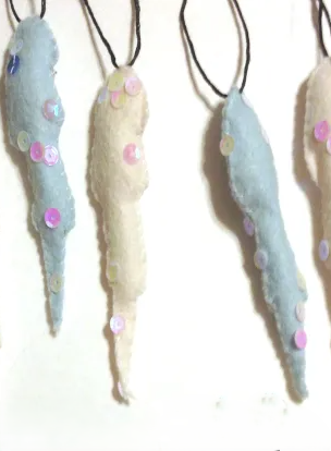 Clear sequins or small crystals sewn along the length give a frozen, sparkly appearance. The narrow shape means they naturally hang straight down from branches. Make several in varying lengths to create a cascading ice effect on your tree.