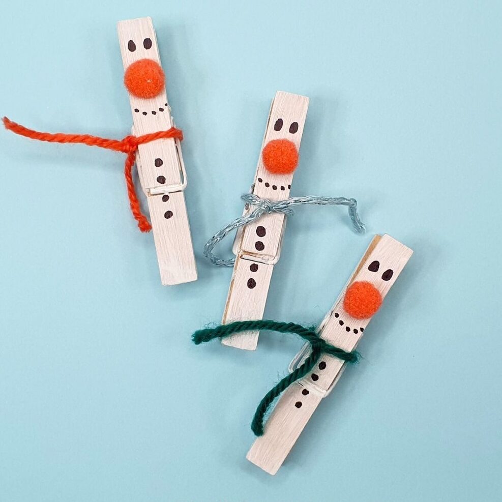 Paint a wooden clothespin white and let it dry. Draw a simple snowman face on the top rounded part with a fine marker. Add a tiny orange dot for the nose. Paint or draw a scarf and buttons on the lower part of the clothespin. You can also add a tiny felt hat or bow to the top for extra decoration. These mini snowmen can hold notes, photos, or artwork on your refrigerator. They also make great package decorations or small gifts for teachers, neighbors, and friends during the winter season.