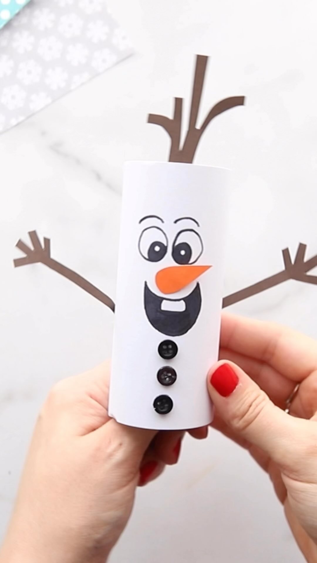 Cover a toilet paper roll with white paint or white paper and let it dry. Draw or paint on a snowman face with black dots for eyes and a smile. Add an orange triangle nose using paint, marker, or paper. You can also add buttons down the front with markers or actual small buttons. For the hat, use black construction paper rolled into a cylinder and glued on top. These are quick to make and use up materials you’d usually recycle anyway.