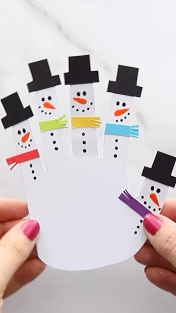 Trace your child’s hand on white paper or cardstock and cut it out. Glue the handprint vertically onto a folded card with the fingers pointing up. The palm becomes the snowman’s body and the fingers become the background or decorative elements. Draw a face on the palm area with markers. Add a hat at the top using black paper and a scarf where the wrist meets the palm. You can decorate the background with snowflakes, falling snow, or winter scenery. Write a message inside the card. These make heartfelt gifts for grandparents or special keepsakes showing how small their hands were.