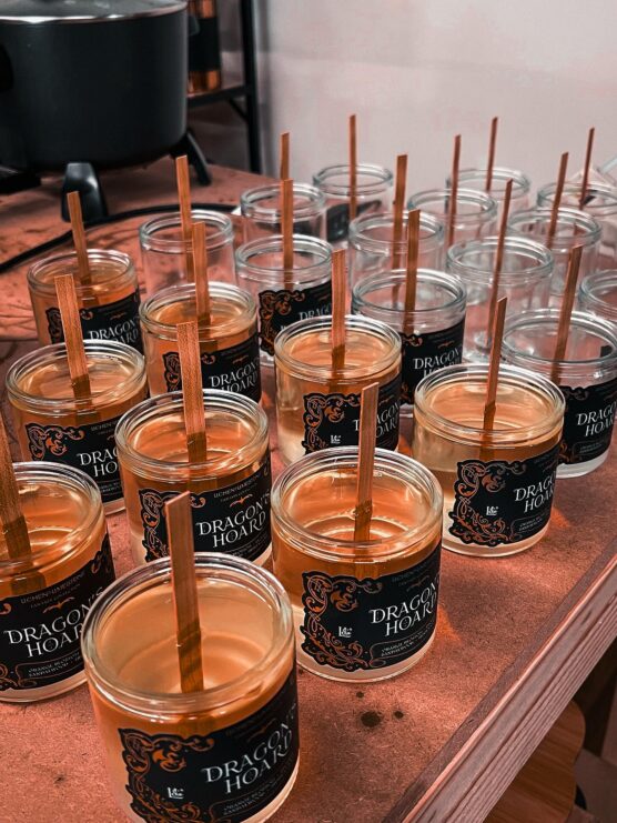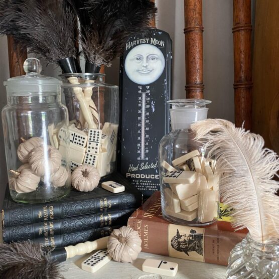 Custom-blended candles fill your home with the perfect Halloween atmosphere through scent as well as sight. Rich colors like deep orange, burgundy, and black look sophisticated in glass containers, while scents like cinnamon, clove, cedar, and patchouli create the perfect autumn ambiance.