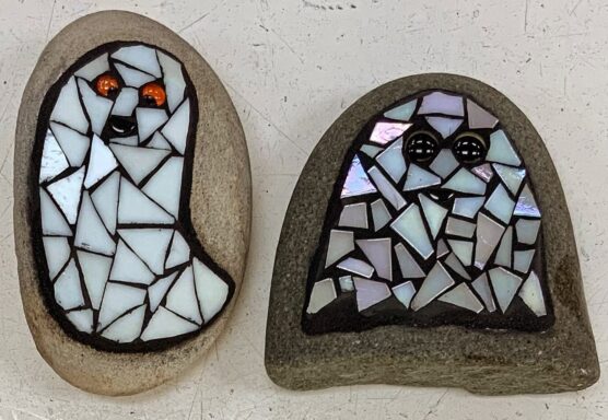 These permanent art pieces withstand weather and actually improve with age as the grout settles and the colors mellow. The mosaic technique allows for incredible detail and color variation, while the stepping stone format makes these pieces both functional and beautiful. They create a magical pathway that welcomes visitors with handmade Halloween charm.