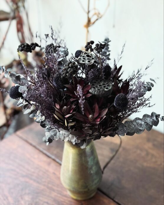 Deep burgundy, burnt orange, and black flowers create stunning autumn arrangements with a gothic twist. Use flowers like black dahlias, orange marigolds, and dark purple statice, combined with dried branches and seed pods.