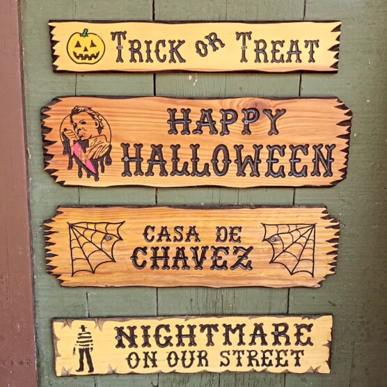 Rich wood grain provides the perfect backdrop for carved Halloween messages or imagery. Whether you use a wood burning tool, carving knives, or a router, the natural material adds warmth and rustic charm to spooky themes.