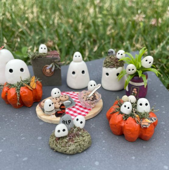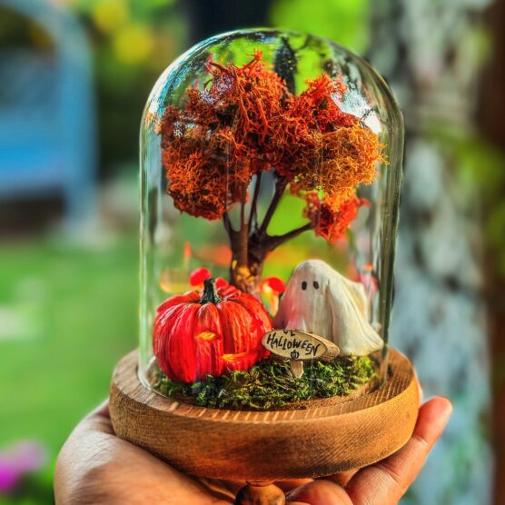 Detailed miniature scenes created from polymer clay capture Halloween magic in tiny, precious vignettes. These small sculptures might depict tiny haunted houses, miniature pumpkin patches, or elaborate witch’s laboratories complete with tiny bottles and spell books.