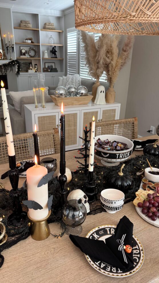 These dark, mysterious birds create such a dramatic, Edgar Allan Poe atmosphere with their glossy black feathers and beady eyes. Perched on your candlesticks, they look like they’re guarding the table or perhaps delivering messages from beyond. The ravens add this literary, Gothic element that makes dinner feel more like a scene from a dark fairytale. Their presence creates this sense of mystery and magic that elevates the whole Halloween experience.