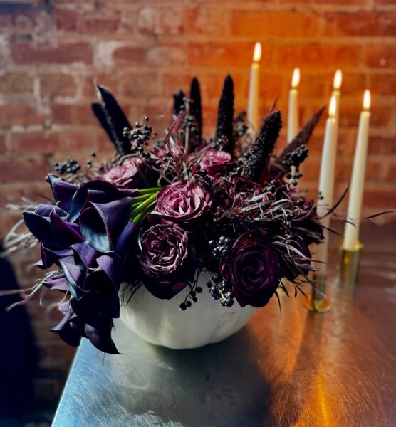 These rich autumn blooms create such a vibrant, witchy color palette that feels both natural and magical. The deep oranges and mysterious purples work together like a sunset over a haunted forest. Fresh flowers add life and beauty to your Halloween table while staying perfectly on theme with their dramatic colors. The arrangements feel both elegant and enchanting, like they were picked from a witch’s secret garden.