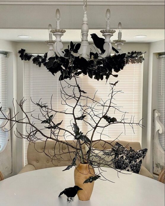 These twisted branches create such a haunting, forest-like canopy over your table with their dark silhouettes and fluttering bat friends. It feels like dining in an enchanted woods where friendly creatures of the night come to visit! The branches add height and drama while the bats create movement and life. The whole effect is both spooky and natural, like Halloween has grown right up from the forest floor.