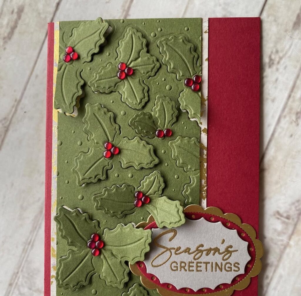 The raised texture of foam leaves gives these cards such a sophisticated, traditional feel. You can almost feel the surface detail under your fingertips, and when paired with red sticker stones for berries, they create that classic Christmas color combination we all love.