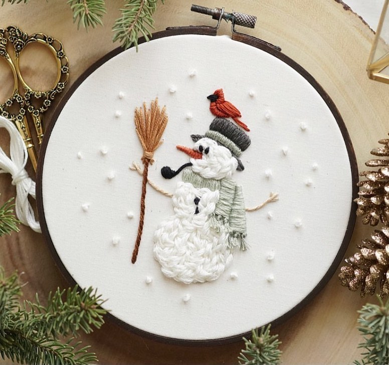 The tiny, precise stitches of hand embroidery give these snowmen such charming character and personality. Each French knot and satin stitch is visible, showing the time and care that went into creating them.