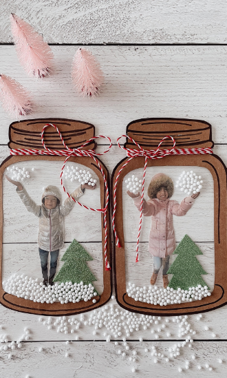 A photograph cutout, a snowy tree, and small white snowballs come together to form a magical, personalized scene. The simple materials capture the feel of a snow globe in a creative way, making each piece feel both nostalgic and unique.