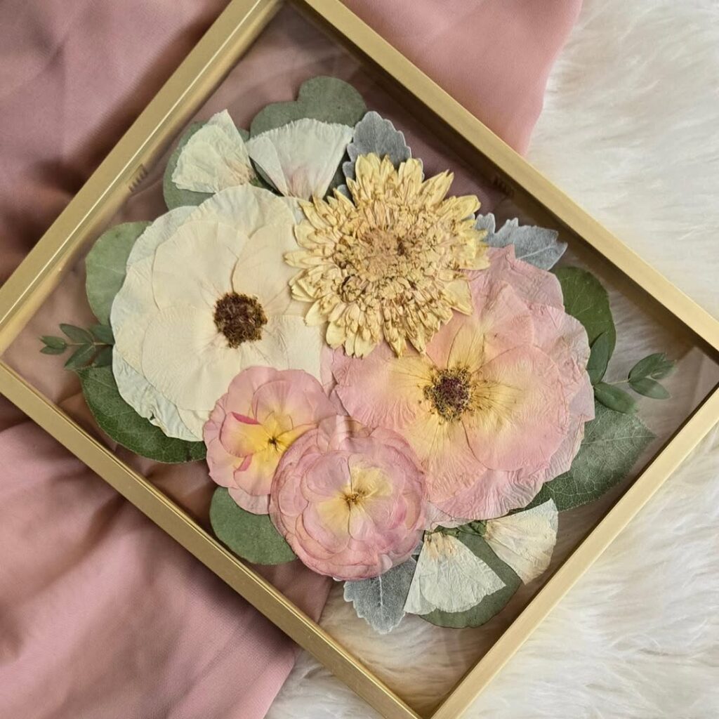 The translucent quality of pressed flowers gives them an almost ghostly beauty, and their muted colors work perfectly with a wooden frame and a transparent background.