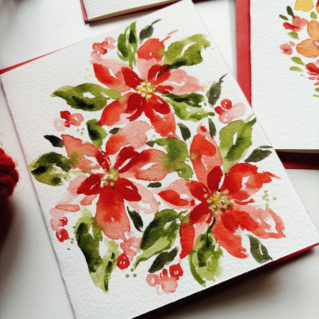 The soft, flowing petals of watercolor poinsettias have such natural beauty and movement. The paint bleeds and blends to create realistic color variations, from deep crimsons to soft pinks with hints of green in the leaves.