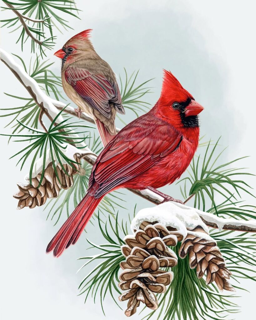 The bright red plumage of a cardinal against soft watercolor branches creates such striking natural beauty. The contrast between the vivid bird and the muted winter background makes the cardinal seem to glow with life and warmth.